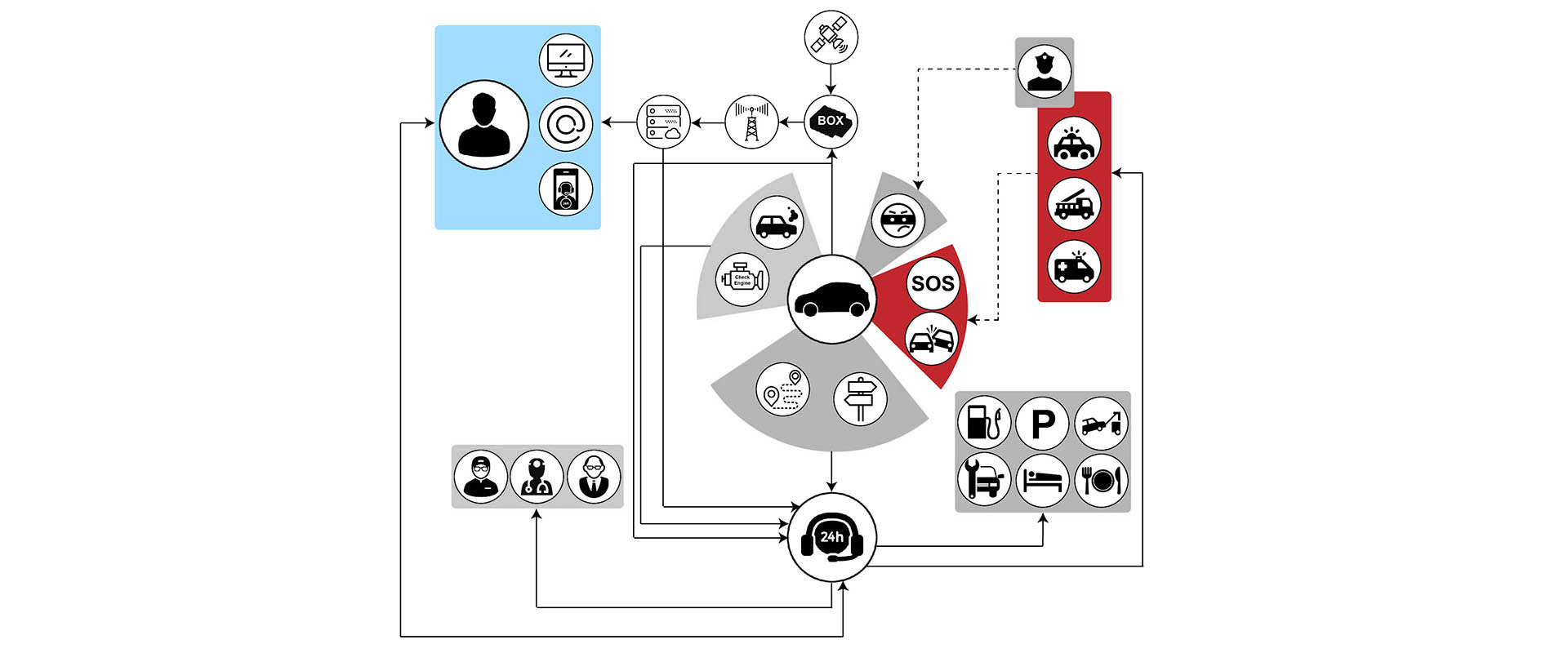 Podstawową funkcją zainstalowanego w aucie urządzenia telemetrycznego jest ciągła analiza zachowania pojazdu w czasie jazdy. Zasada działania polega na tym, że zainstalowany w urządzeniu akcelerometr wykrywa przeciążenia lub zmiany kątów i z chwilą przekroczenia parametrów krytycznych dla systemu wysyłany jest sygnał do Call Center wraz z jego dokładną pozycją określoną przy użyciu GPS. Szczegółowe dane o przebiegu wypadku (pozycja, prędkość, wartości składowych przyśpieszeń) składowane są na serwerze i w wydzielonej pamięci (buforze) urządzenia. Dane te mogą być następnie analizowane w celu ustalenia przyczyn wypadku (black box). W trakcie postoju urządzenie pełni funkcję antykradzieżową, informując o nieautoryzowanym holowaniu, przemieszczeniu pojazdu lub zaniku zasilania.